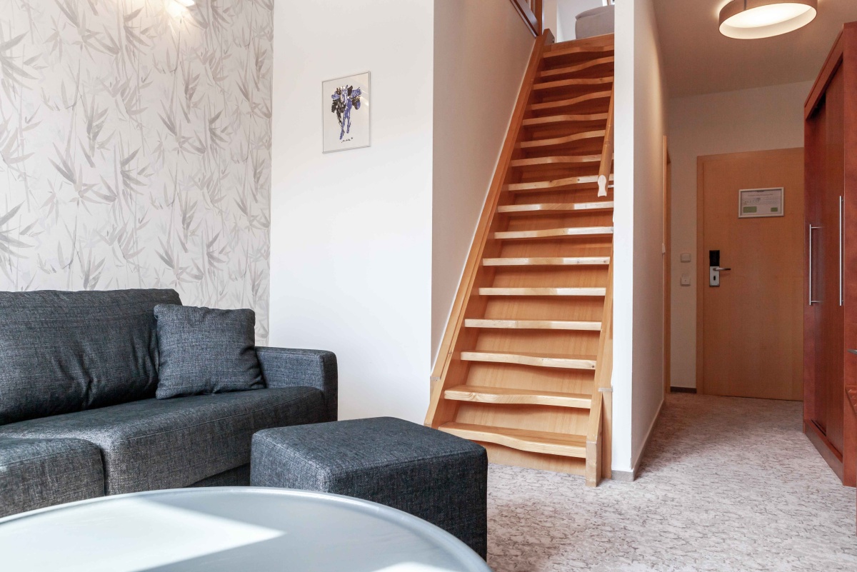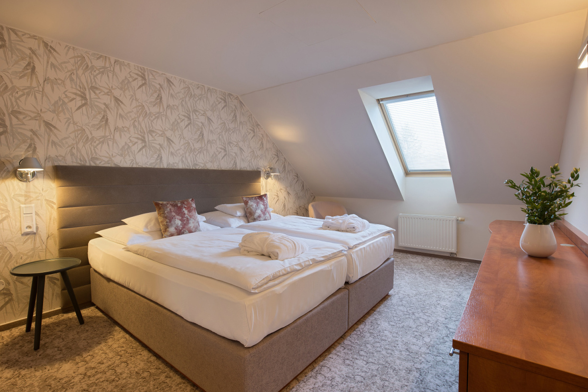Hotel nabízí několik možností k ubytování. My jsme byli ubytováni v Depandance s dvoulůžkovými pokoji kategorie 4*. Všechny pokoje byly v přízemí, s terasou a výhledem na malý vesnický rybníček. Od hlavní hotelové budovy s restaurací k Depandance je to pár kroků. Stejně tak i do wellness a kongresového sálu, kde probíhaly cvičební lekce. Ticho a klid ruší jen občasné zařehtání koní nebo kokrhání kohoutů. Prostě vesnická idylka.